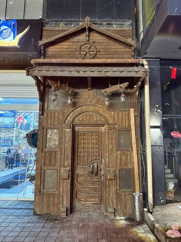 - Qapı: mərkəzi açılan taxta qapı, dekorativ barmaqlıq panelləri, yarımdairəvi karniz, xüsusi formalı tutacaq