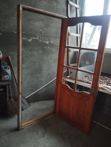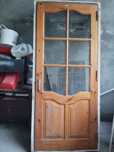 Taxta giriş/qapı dəsti - Material: təbii ağac (şam tonlarında), laklı səth - Dizayn: yuxarı hissədə 6 bölməli şüşəli pəncərə, aşağı hissədə dekorativ panellər - Komplektə daxildir: - Qapı yarpağ...