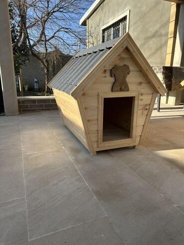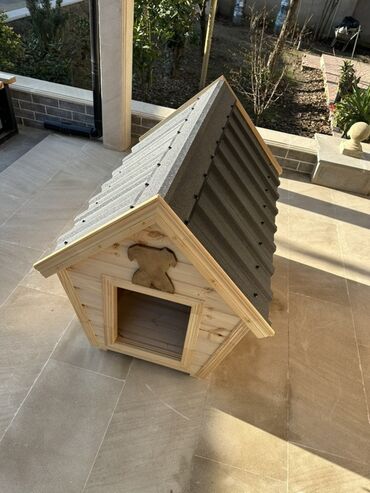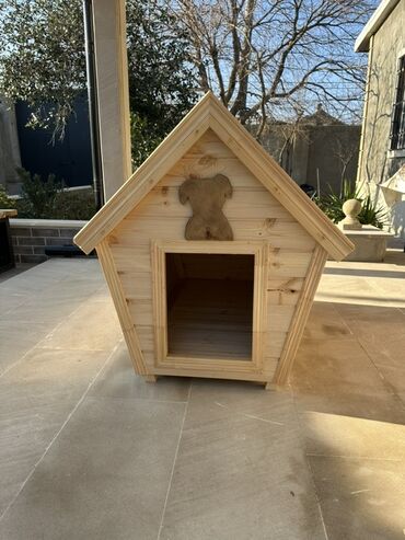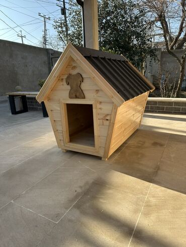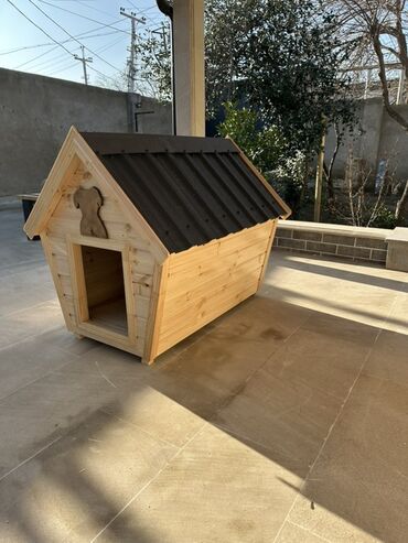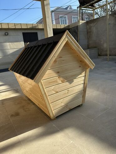 Taxta it evi - Material: qalın taxta lövhələr, üstü faner/kontrplak damla örtülüb - Ölçü: orta ölçülü itlər üçün rahat daxili məkan (giriş qapısı taxta tağlı) - Konstruksiya: yerdən bir qədər hünd...