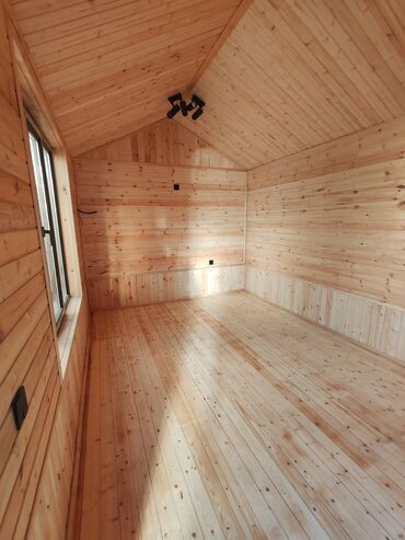 - İstifadə materialları: Divarlar və tavan tam taxta üzləmə (astara), əsas otaqda taxta döşəmə; giriş zonasında keramoqranit/laminat tipli kafel; sanitar qovşaqda mərmər naxışlı kafel.