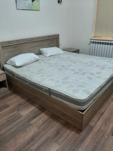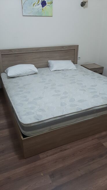 İkianalı böyük yataq dəsti Tecili satilir!!!Matras daxildi - Ölçü: təxmini 160x200 sm (king-size tipli iki nəfərlik) - Korpus: açıq ağac laminat, alt hissə qapalı baza ilə - Başlıq: bej rəngli yum...