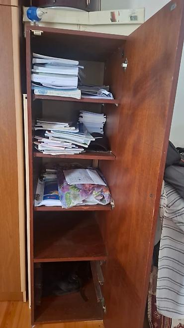 Mebel növü: kitabxana/şkaf Təsvir: - Minimalist dizaynlı, şaquli formalı saxlama şkafı - Rəng: açıq ağac teksturalı fasad + tünd boz/qaranlıq daxili hissə və alt baza - Quruluş: sol tərəfdə açıq rə...