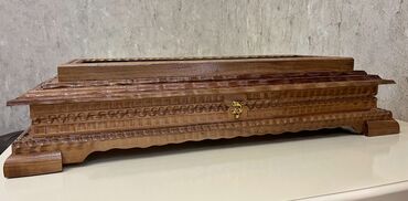 Taxta oyma sandıq/çərçivəli konsol - Material: kütük taxta, tamamilə əl oyma naxışlarla bəzədilib - Forma: çoxbucaqlı (önü geniş, küncləri kəsik), dekorativ alt baza və qalın üst qapaq - Üst hissə...