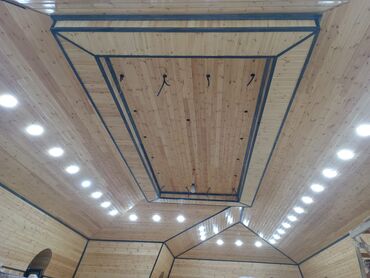 Taxta tavan və işıqlandırma ilə dekorativ daxili tavan işləri - Material: təbii ağac (laklanmış), lövhələr “balıqsırtı” və paralel istiqamətdə yığılma - Konstruktor həlli: çoxbucaqlı/tağvari forma...