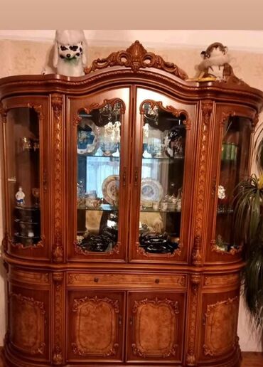 - Vitrin-bufet: kəskin klassik xətləri və zəngin oyma detallar ilə. Üst hissə dörd şüşə vitrin qapısından ibarətdir, daxilində şüşə rəflər və dekorativ işıqlandırma üçün uyğun quruluş. Yanlarda əlavə vitrin bölmələri. Aşağı hissədə qapalı dolab bölmələri və çekmecələr – qab-qacaq və tekstil üçün geniş saxlama imkanı.