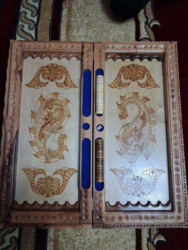 - Fiş və zərlər: taxta fişlər üçün mavi məxmər yuvalar, 2 zər və fiş dəsti daxildir