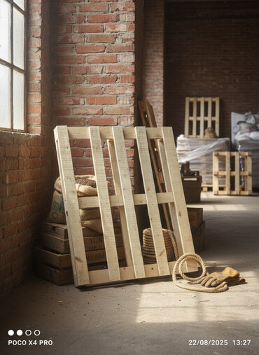Taxta paletlər - Material: şam/qarışıq taxta, bəzi hissələrdə MDF/kontrplak ara qatları - Konstruksiya: üç traversli, blok ayaqlı; üst panel lövhələrdən yığma - Ölçü: standartlara yaxın (təxmini 7...