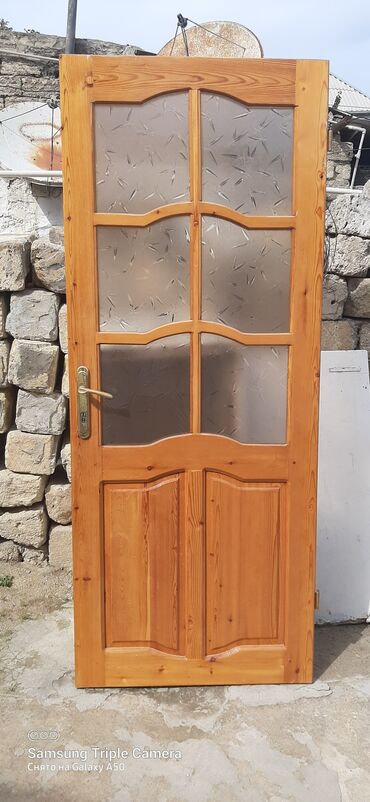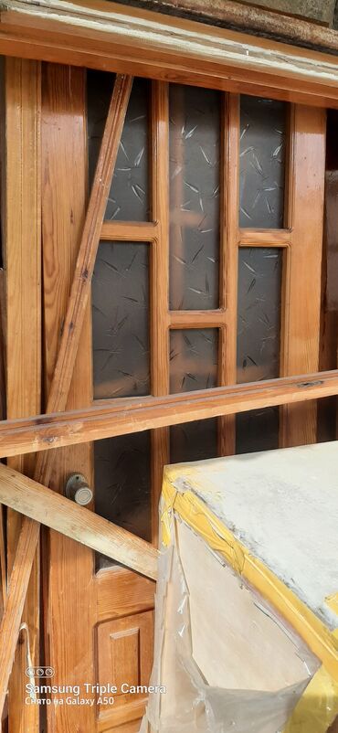 Shabalid agacindan qapilar. Cercivesiz. 4 eded süşəli(birinin şüşəsi qırığdır) və 2 ədəd şüşəsiz(hamam üçün) Yataq, metbe ve hamam ucun(şüşəsiz olanlar)