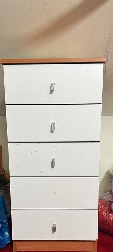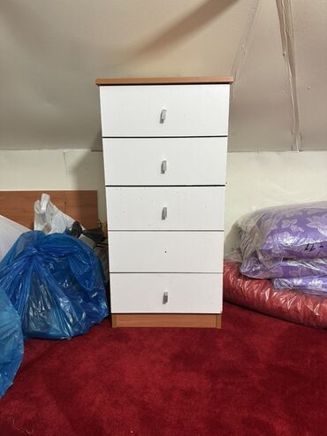 Ağ və qəhvəyi rəngdə, güzgülü taxta qarderob dəsti. Bu dəst iki yan qarderob və bir siyirtməli şkafdan ibarətdir. Yan qarderoblarda ikiqapılı saxlama bölmələri və ortasında güzgü var. Hər iki yan qarderobda metal tutacaqlar mövcuddur. Siyirtməli şkafda altı siyirtmə və metal tutacaqlar var. Bu dəst yataq otağı və ya paltar saxlamaq üçün uyğundur.