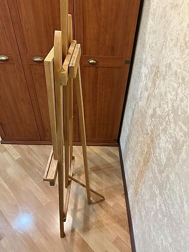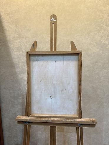 Taxta rəssam molberti və aksessuarları - Material: təbii ağac və MDF. - Molbert: studiya tipli, təkərlidir, hündürlüyü tənzimlənir. Kətan/sxem lövhəsini saxlayan ön rəf var, yan tərəfdə fırça və a...