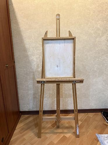 Taxta rəssam molberti və aksessuarları - Material: təbii ağac və MDF. - Molbert: studiya tipli, təkərlidir, hündürlüyü tənzimlənir. Kətan/sxem lövhəsini saxlayan ön rəf var, yan tərəfdə fırça və a...Giriş•Qeydiyyat