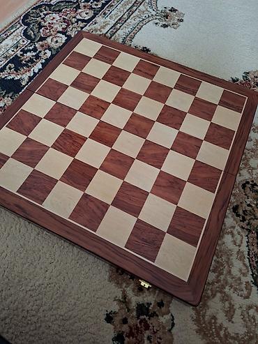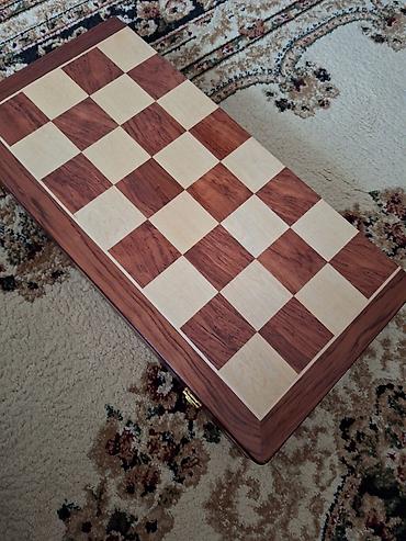 - Lövhə: qatlanan, qapaqlı-sandıq tipli konstruksiya; kənarları taxta haşiyəli, kvadratlar açıq/tünd ağac teksturalıdır. Qatlandıqda daşımaq üçün kompakt olur, metal kilid mexanizmi var.