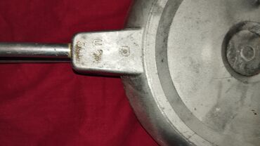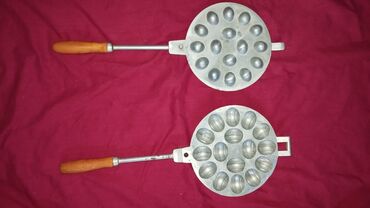 Alüminium qəlibli, taxta saplı qazandibi soba/ocaq üstü şirniyyat aparatı – “qoz” formalı peçenye üçün iki tərəfli tökmə dəmir qalıp.