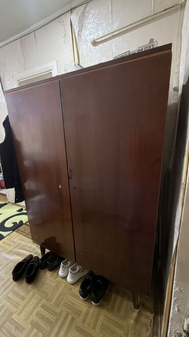- Şkaf: 2 qapılı, taxta karkaslı, tünd qəhvəyi rəng. Sadə, hamar ön panel, dairəvi tutacaq, kilid yeri mövcuddur. Hündür ayaqlı quruluş sayəsində alt hissədə hava dövranı və təmizləmə rahatdır. Palto, paltar və digər əşyalar üçün geniş saxlama imkanı verir.