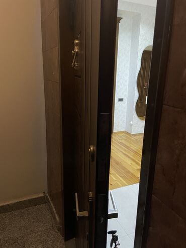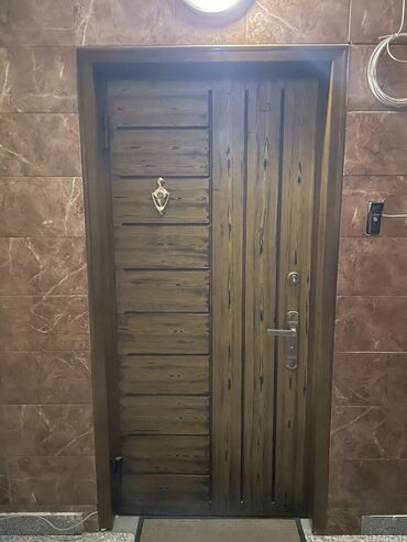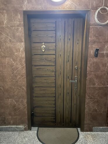 Mebel qapısı – taxta teksturalı qaranlıq qəhvəyi örtüklə. - Material: metal karkaslı, ağac naxışlı laminalı üzlük. - Ölçü: standart giriş qapısı ölçülərinə yaxın (təxminən 90–100 sm en, 200–210 sm...