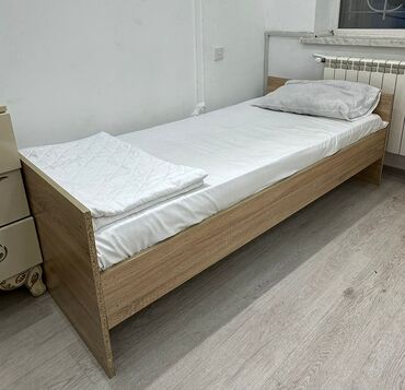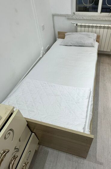 Məhsul: Tək nəfərlik çarpayı dəsti - Ölçü: standart tək nəfərlik (təxmini 90x200 sm). - Material: MDF/laminat korpus, yumşaq başlıq hissəsi (parça ilə kapitonaj və ya süngərli panel). - Rəng v...