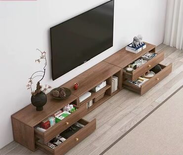 Taxta TV stendi / media konsolu - Minimalist skandinaviya tərzində dizayn: isti qəhvəyi ağac teksturası, düz xətlər və aşağı profil. - Modul quruluş: yan hissələr çekmecəli, mərkəz hissə açıq rəfl...