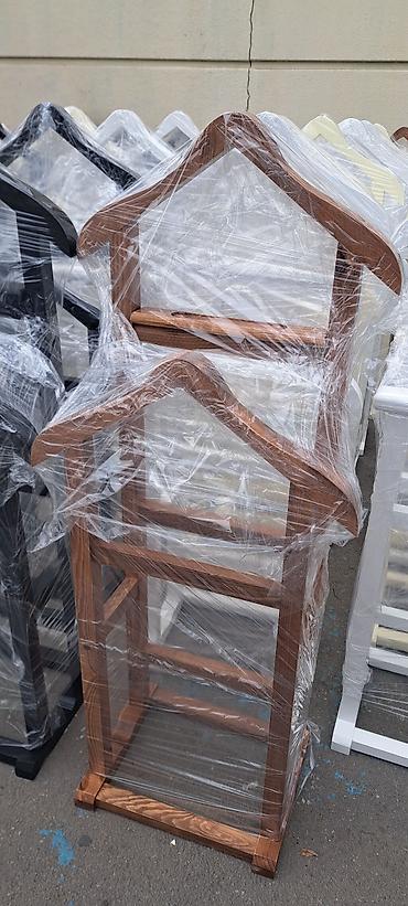 Taxta paltar asqısı – stend tipli - Material: bərk ağac (boyalı və laklı variantlar) - Rənglər: ağ, qəhvəyi (taxta teksturalı), qara, krem - Konstruksiya: üst hissədə geniş asqı formasında çiyinli...