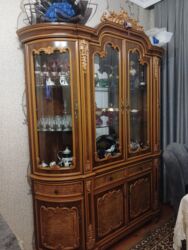 Klassik üslubda vitrin-bufet - Material: tünd qoz rəngli ağac karkas - Dekor: əl işinə bənzər qızılı oyma naxışlar, tac hissəsində ornament - Ön hissə: geniş şüşəli qapılar (sağ və sol tərəfdə iki...