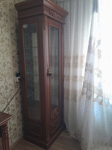 - Klassik vitrin şkaf: Təbii ağac tonlarında, zəngin oyma dekorlu fasad. Ön və yan tərəflər şüşəlidir, içəridə 3 şüşə rəf var – qab-qacaq, suvenir və kolleksiya əşyalarının sərgilənməsi üçün əlverişlidir. Metall dəstəklı dekorativ qulpu, aşağı hissədə kiçik çekmece. Üst taxtada və plintusda klassik profil işləmələri.