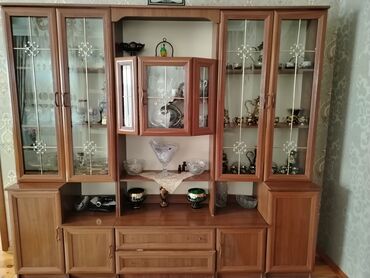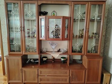 Məhsul: Taxta mebel dəsti və daxili qapılar - Divar boyu modul şkaf: 2 hissədən ibarət iri kompozisiya. Üst bölmələrdə dumanlı şüşəli vitrin qapıları, içəridə rəflər. Orta hissədə açıq niş sahələr...