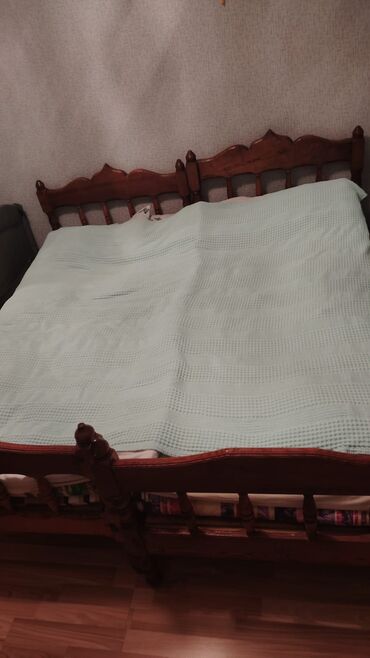 Yataq otağı və qonaq otağı üçün mebel dəsti - İki nəfərlik taxta çarpayı: qəhvəyi ağac başlıq və karkas, üzərində toxumalı açıq rəng örtük. Kənarları hamar, klassik düz başlıqlı model, standart ik...