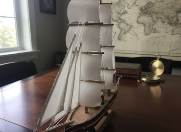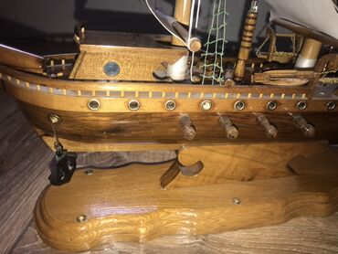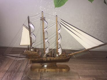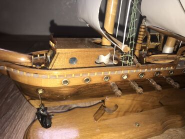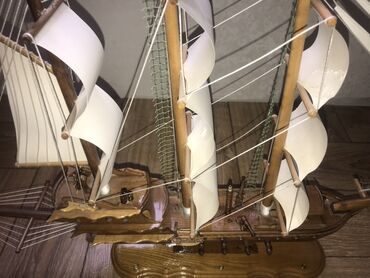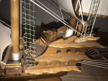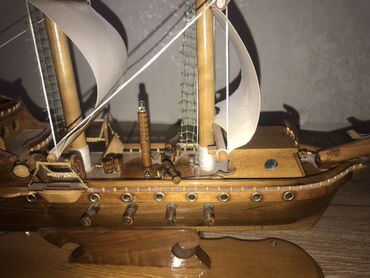 Taxta yelkənli gəmi maketi - Material: tamamilə ağacdan hazırlanmış korpus, deşik və bəzəklər incə oyma ilə işlənib - Yelkənlər: ağ rəngli, sıx parça/plastik materialdan, çoxmərtəbəli dirəklərə bə...