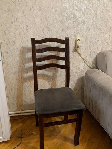 - Stul: Tünd taxta karkas, dalğavari lamelli arxa dayaqlı. Oturacaq tekstil (zərif tüklü/velur tipli) üzlüklə örtülüb, rəngi tünd boz-qara tonlarda. Konstruksiya klassik düz ayaqlıdır, aşağıda bərkidici çərçivə ilə möhkəmləndirilib.