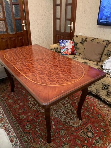 - Masa: Düzbucaqlı formalı, tünd qəhvəyi massiv taxta karkas. Üst hissə parlaq laklıdır, mərkəzdə dekorativ naxışlı taxta şpon işləməsi və kənarlarda zərif kontur xətti var. Küncləri yumşaq radiusludur. Qövsvari formaya sahib gücləndirilmiş ayaqlar sayəsində sabitdir. Ailə naharları və qonaqlama üçün geniş səth.