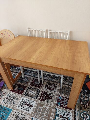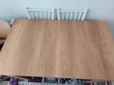 Taxta yemək/iş masası - Material: təbii ağac/şpon səth, dördkünc forma - Rəng: açıq qəhvəyi - Konstruksiya: 4 ədəd düzbucaqlı taxta ayaq, üst hissə 2 paneldən ibarətdir (ortadan birləşmə xətti var...
