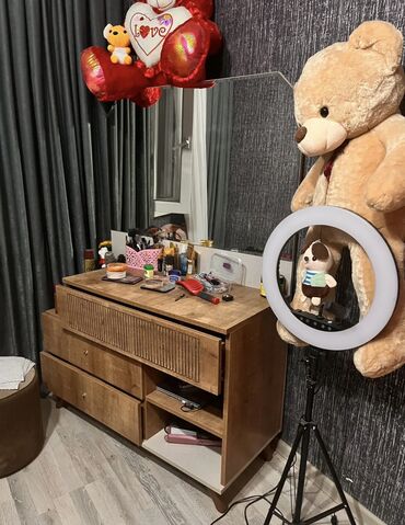 Vizaj/komod tipli makiyaj masası və güzgü dəsti - Material: taxta teksturalı laminat üst səth və qapılar, krem rəngli parlaq MDF fasadlar - Komplekt: geniş masaüstü, iri divar güzgüsü, güzgü tərəf...