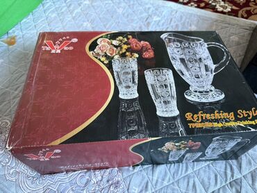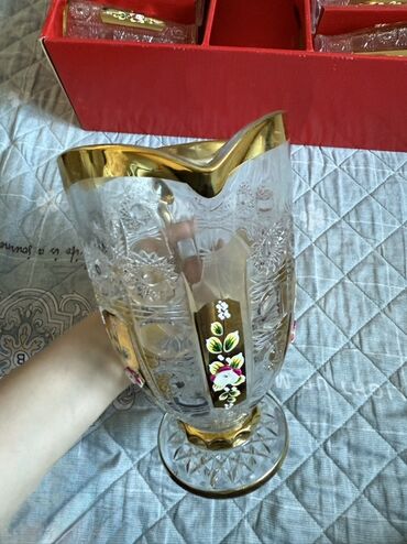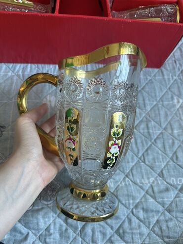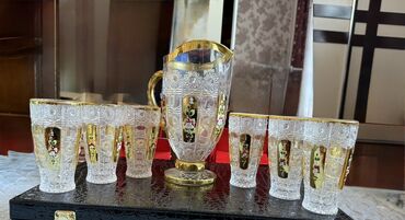 Şüşə sürahi və stəkan dəsti - Rəng: tünd şampan/bronza tonlarında - Naxış: qızılı haşiyə və çiçək ornamentləri - Komplekt: 1 ədəd sürahi + 6 ədəd stəkan - Material: şüşə - Dizayn: sürahidə tökmə ü...