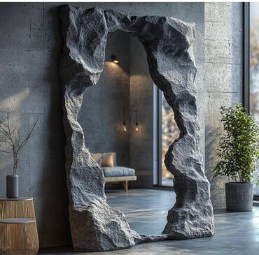 - “Qaya” konturlu böyük güzgü çərçivəsi: Təbii qaya kənarlarını xatırladan heykəltəraşlı daş çərçivə, döşəmədən tavana ölçülü estetika. Loft, industrial və müasir interyerlərdə vurğu element kimi önə çıxır.