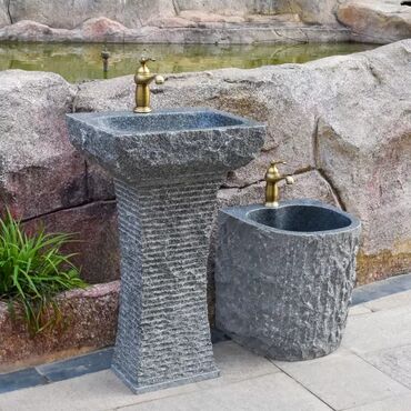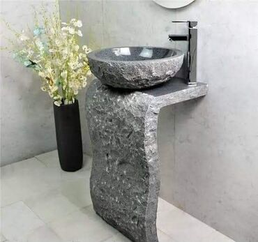 - Təkday daşdan lavabo: Əl işı ilə yonulmuş bazalt tipli blokdan formalaşan konsol və üstündə qab formalı daş kasa. Mat daş teksturası, inteqrə planka və qarışdırıcı üçün platforma. Minimalist sanitar qovşaqlar və spa üslubunda vannalar üçün.