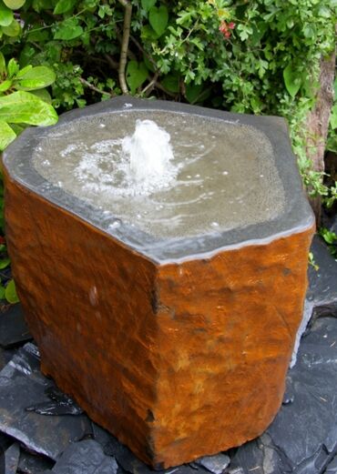 - Bağ bulağı/fünkyar: Qab formalı yuxarı səthdən su çıxışı olan monolit daş kub. Hovuzsuz qapalı dövriyyə üçün uyğundur, landşaftda skulptural su elementi kimi işləyir.