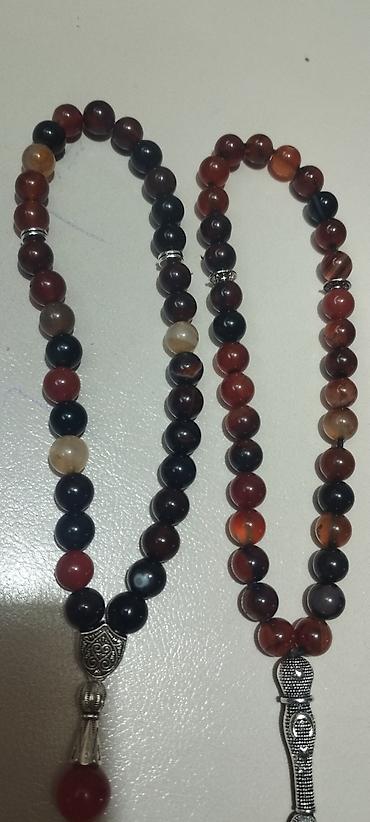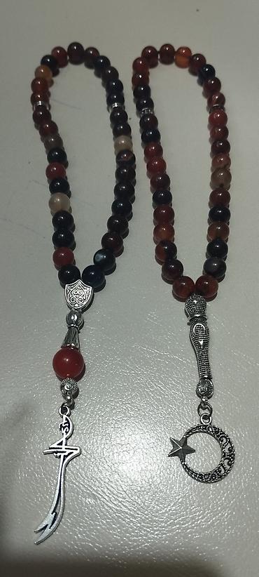 Məhsul: Təsbeh dəsti - Naxışlı metal imaməli və zəncirli təsbeh - Fərqli rənglərdə sıxma kəhrəba/ateş kəhrəba: - Qırmızı–şəffaf qarışıq silindrik muncuqlu model, zəncir ucunda metal düyün forma...