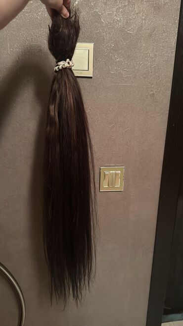 Təbii insan saçı – uzun tünd qəhvəyi hörük dəstəsi.