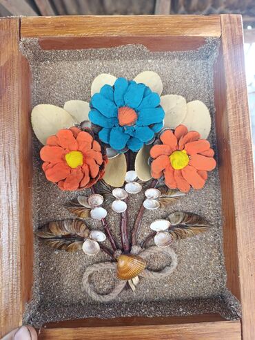 - 1-ci kompozisiya: taxta çərçivədə qum fon üzərində dəniz çanaqları və boyalı elementlərlə düzəldilmiş üçgül çiçək buketi. Yarpaq və saplar təbii materiallardan yığılıb, kompozisiya qumla işlənmiş rellef fonla tamamlanıb.