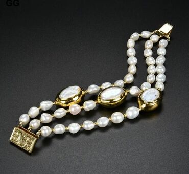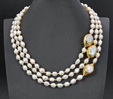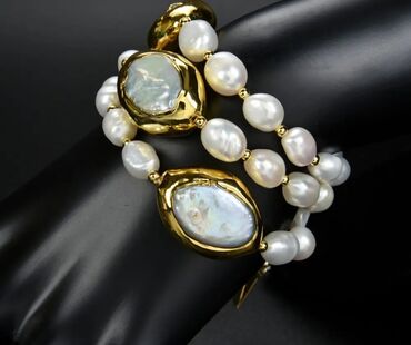 Təbii inci dəst – uzun boyunbağı və qolbaq - material: yumurta formalı təbii ağ/gümüşü incilər - aralıq detalları: qızılı rəngli dördyarpaq (quatrefoil) metal elementlər - qapanma: çiçək motivli d...