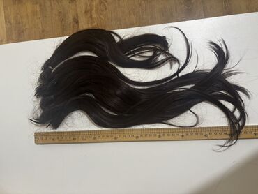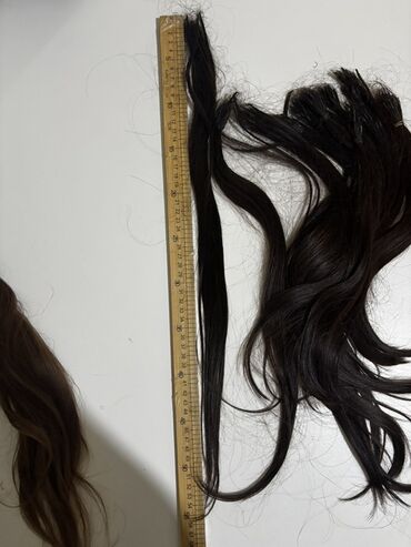Təbii insan saçı – tünd qəhvəyi/şabalıd tonunda, qalın həcmlidir. Şəkildə ölçü xətti ilə göstərilib: təxmini uzunluq 55–60 sm civarında. Rəng tək tonlu, təbii parıltılıdır; 900e alinib 1 hefte taxi...