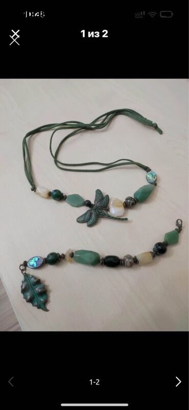 - Kolye: yaşıl dəri/süet iplə tənzimlənən uzunluq, mərkəzdə metal qarmonlu çəyirtkə/şəbnəmqanad motivi, yanlarda müxtəlif ölçülü fasetli və hamar muncuqlar, bir ucdakı dairəvi naxışlı qabıq tipli element.