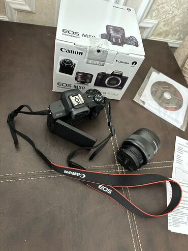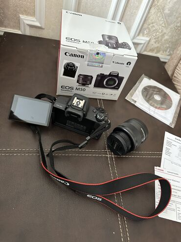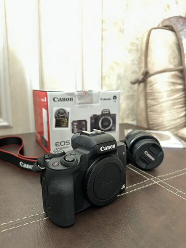 Canon M50 15-45mm. Bir neçə il öncə Türkiyədən şəbəkə mağazadan alınıb (teknosa cevahir avm). Demək olar ki işlənməyib, sadəcə həvəskar çəkilişlər olub. Yenidən fərqi yoxdur.
