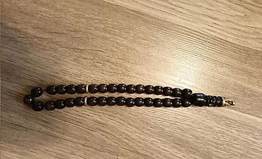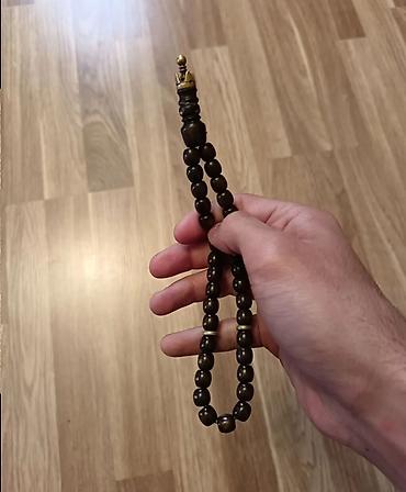 Əl işı təsbeh dəsti - Material: qara-qəhvəyi tonlarda cilalanmış təbii ağac və qatran qarışığı muncuqlar; bəzilərində krem rəngli halqalar və metal (qızılı ton) ara həlqələr - Muncuq forması: iri,...