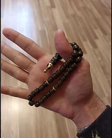 Taxta təsbeh dəsti - Material: taxta muncuqlar (tünd qəhvəyi və açıq-qəhvəyi tonlarda), bəzək elementləri və ucluqlar metal (qızılı rəng). - Modellər: 1) Qara iri muncuqlu model – elastik sap üz...