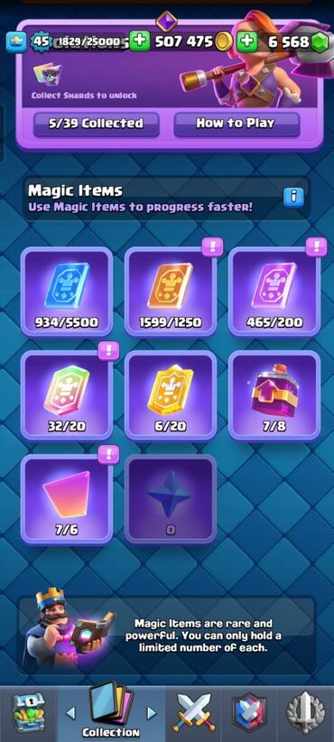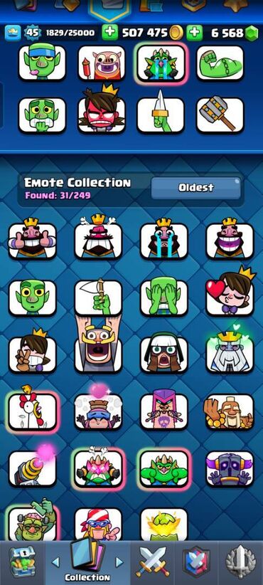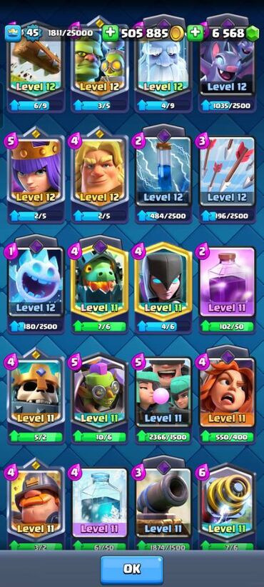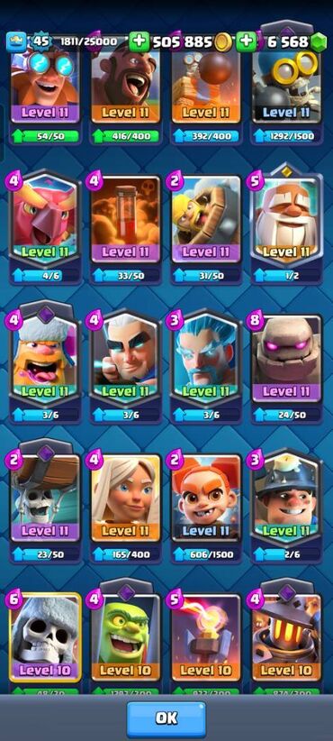 Xüsusiyyətlər: - Kral səviyyəsi: 43 - Kuboklar: 8508 - Qızıl: 362220 - Xüsusiyyətlər: - Kral səviyyəsi: 43 - Kuboklar: 8508 - Qızıl: 362220 - Yaşıl daş: 3792 - Pass Royale irəliləyişi: 10/20 - Kart...