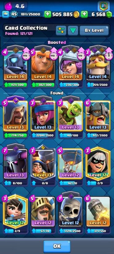Xüsusiyyətlər: - Kral səviyyəsi: 43 - Kuboklar: 8508 - Qızıl: 362220 -