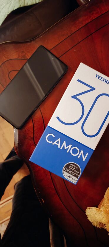 TECNO Camon 30 smartfonu - Model: TECNO Camon (arxa qapaqda “TECNO CAMON” yazısı) - Rəng: Qara, mat teksturalı arxa panel - Ekran: Tam ekran, yuxarı mərkəzdə ön kamera dəliyi; barmaq izi skaneri e...