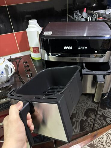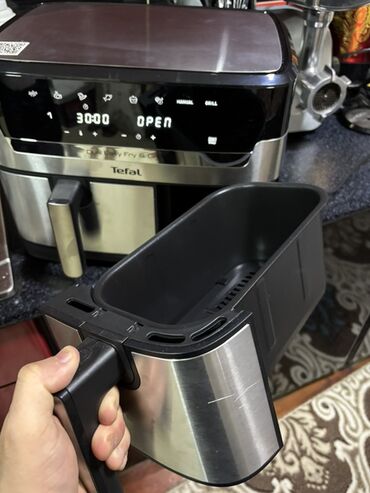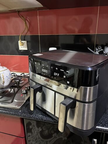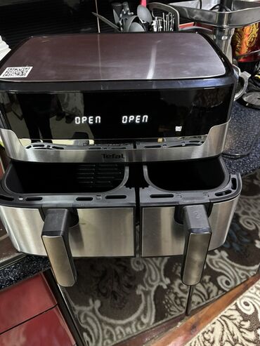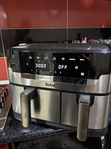 Evimizdəki fotolarda cihazın işlək vəziyyətdə panel göstəriciləri, hər çəkmece üçün ayrıca tutacaq və çıxarılan korbkalar görünür. Qutunun üzərində “Dual Easy Fry & Grill” model məlumatı mövcuddur. Bu cihaz gündəlik sürətli bişirmə, qızartma və grill üçün çoxfunksiyalı mətbəx köməkçisidir.