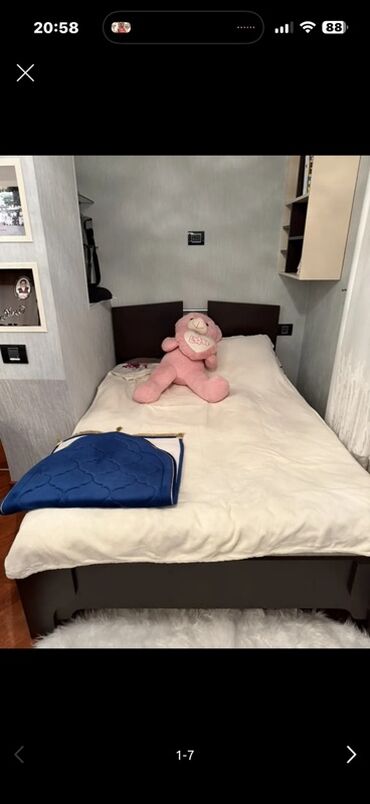 - Döşək: ortopedik tipli, bədənə uyğun rahatlıq (şəkildə üstünə sərilmiş krem örtük var)