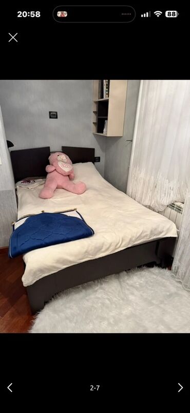 - Komplektə daxil görünənlər: çarpayı karkası, başlıq, döşək, krem rəngli örtük. Mavi yorğan/plaıd şəkillərdə var.